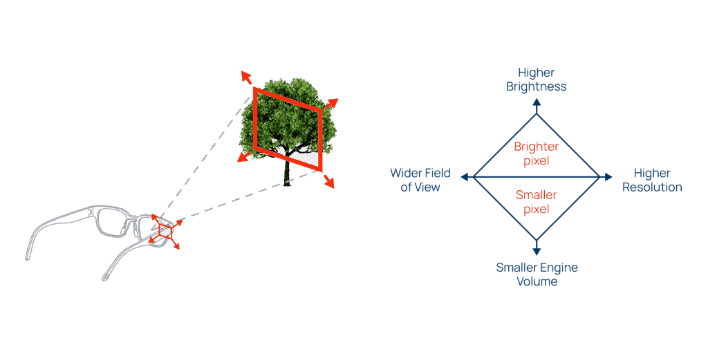 Wide Field of View and high resolution approached with brute force requires too many of too small and too bright pixels, “hitting the 30° FoV sound barrier for AR in an eyeglasses form factor”.