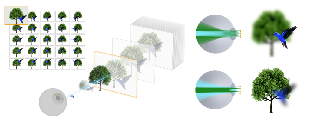 The visual experience is, de facto, linked to a display problem. Today’s AR displays project a flat image (2D) at a fixed distance, much like a TV screen placed at a ~1-meter distance from the viewer. The display projects two images, each with a slightly different perspective, to create the illusion of depth. However, this trick makes the user’s eyes behave in an unnatural way: while they try to converge toward the point where the digital image appears, they also accommodate at a further distance, where the display is projected. This desynchronization between the vergence and the accommodation distance, always synchronized in normal vision, messes with the user’s brain, leading to nausea, eye strain and fatigue. The severity of the symptoms varies by user, but after ~20 minutes of use, most will experience them and will want to remove the device for a much-needed break3.
