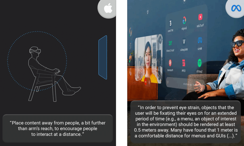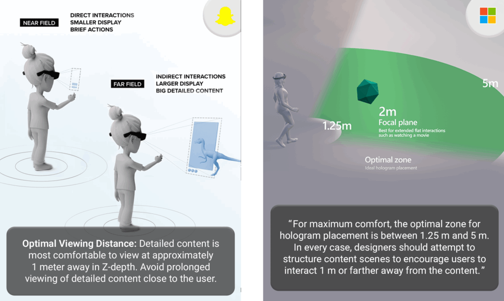 To counter this problem, most AR glasses manufacturers suggest XR interaction designers to place the digital content far (as close as possible to where the image is projected). This way, the delta between the vergence and accommodation distances is reduced or even eliminated. Meta, Apple, Microsoft and Snap have all shared instructions in that sense4.